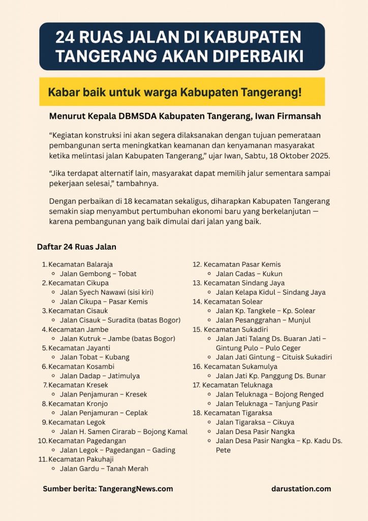 Sumber berita: TangerangNews.com – “24 Ruas Jalan di 18 Kecamatan Kabupaten Tangerang Segera Diperbaiki”, Sabtu 18 Oktober 2025.