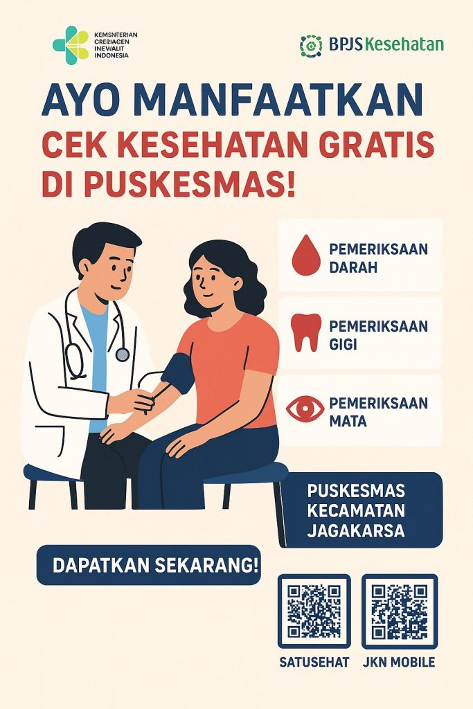 Mari manfaatkan layanan Cek Kesehatan Gratis di puskesmas terdekat, karena menjaga kesehatan sejak dini berarti mempersiapkan masa depan yang lebih baik untuk diri sendiri dan keluarga.