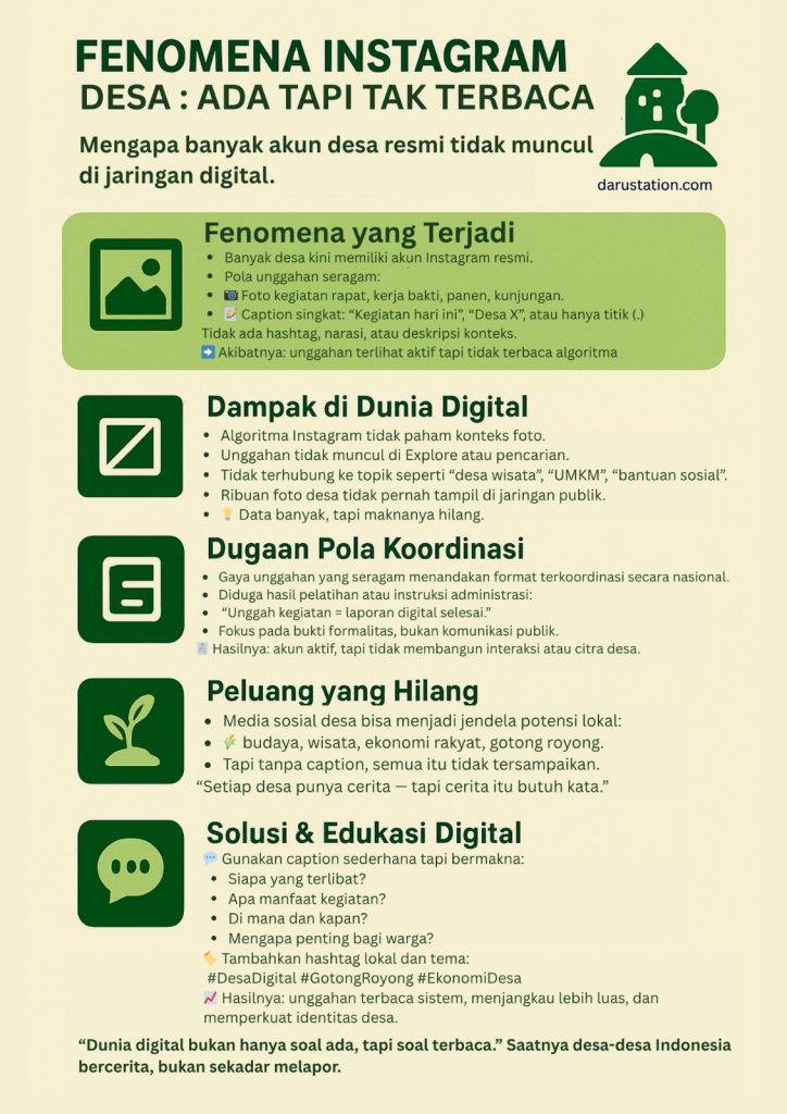 Namun, di tengah arus riuh itu, muncul fenomena yang diam tapi menarik: foto di Instagram yang hanya diberi keterangan singkat atau bahkan tanpa caption sama sekali. Kadang hanya bertuliskan “Kegiatan hari ini”, “Desa X”, atau sekadar “.”.