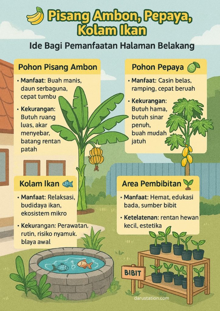 🌿 Di tengah padatnya kehidupan kota, halaman belakang rumah sering kali terabaikan. Padahal, dengan sedikit kreativitas dan komitmen, ruang ini bisa disulap menjadi pusat kehidupan yang sehat, produktif, dan penuh nilai spiritual. Dalam artikel ini, saya akan mengulas secara lengkap bagaimana halaman belakang bisa dimanfaatkan untuk menanam pohon pisang ambon, pepaya, membangun kolam ikan, dan membuat area pembibitan tanaman. Kita akan bahas manfaat, tantangan, dan tips praktisnya.