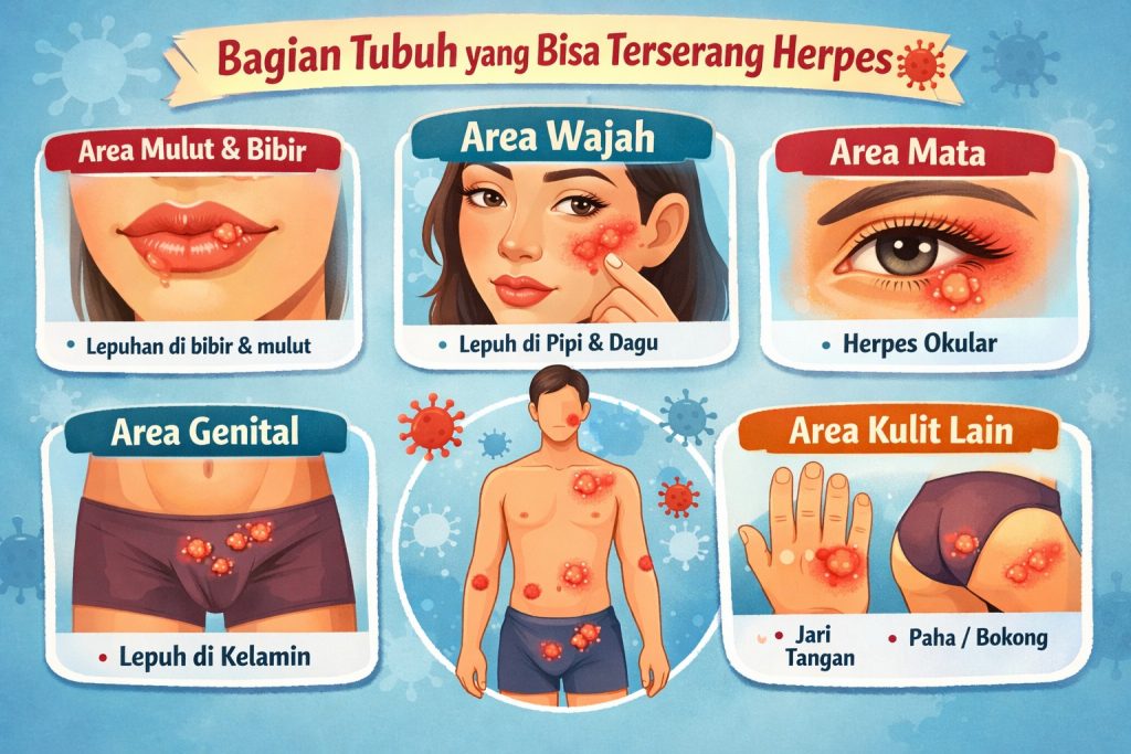 Salah satu hal penting yang sering tidak disadari adalah: herpes tidak hanya menyerang satu bagian tubuh saja. Virus Herpes Simplex Virus bisa muncul di beberapa area berikut: