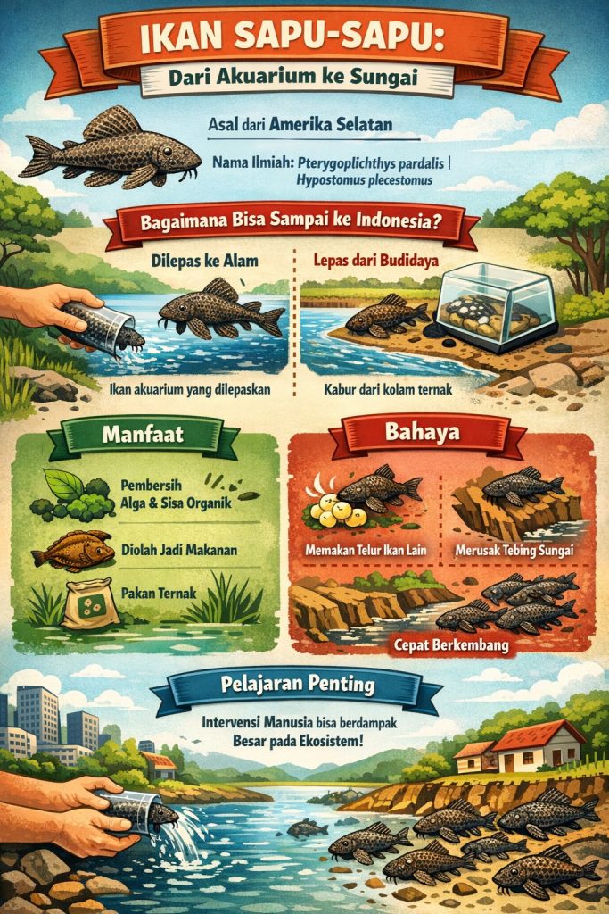 Hari ini, ikan sapu-sapu sudah menjadi bagian dari realitas perairan Indonesia. Ia hadir di banyak tempat, dari kota besar hingga daerah pinggiran.
