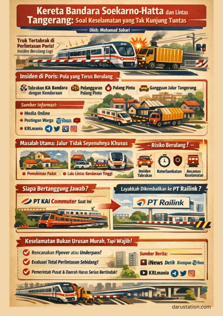 Setiap kali terjadi insiden di lintas Tangerang, publik kembali diingatkan bahwa Kereta Bandara Soekarno-Hatta belum sepenuhnya terbebas dari persoalan klasik perkeretaapian Indonesia: perlintasan sebidang di kawasan padat lalu lintas.