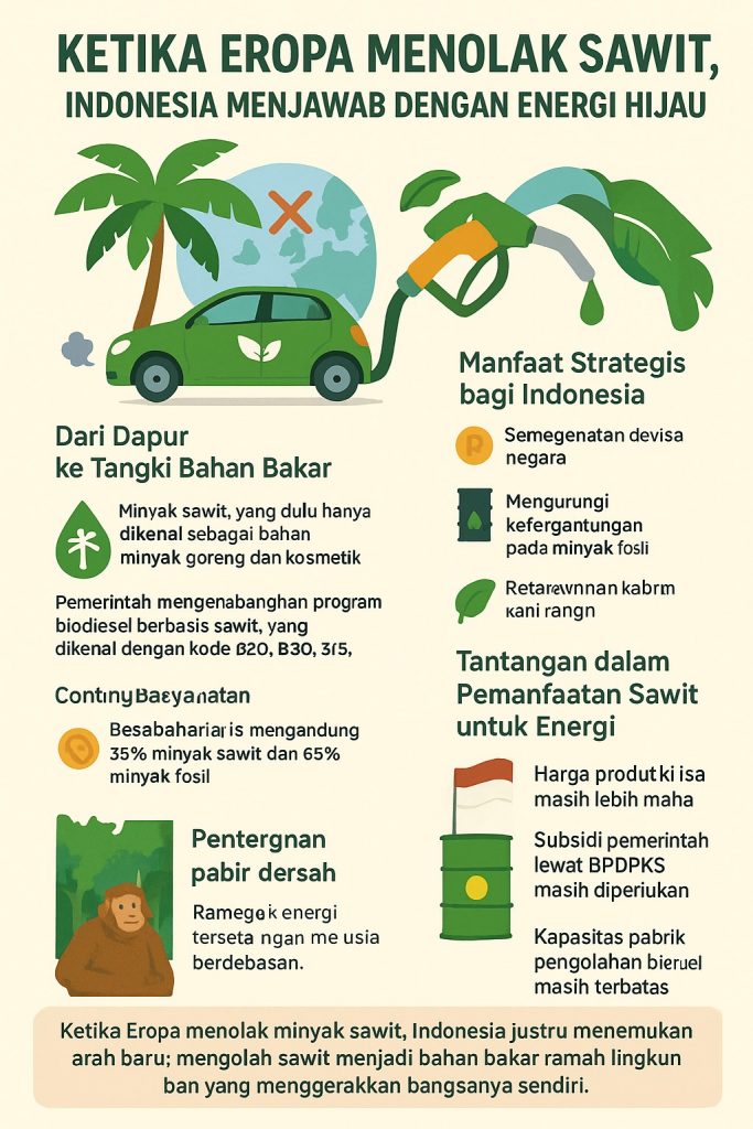 Langkah Indonesia mengubah sawit menjadi sumber energi bukan hanya reaksi terhadap larangan Eropa, tetapi juga strategi jangka panjang menuju kemandirian energi.