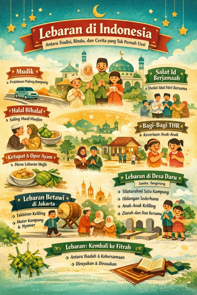 Lebaran di Indonesia adalah perpaduan antara agama dan budaya, antara ibadah dan kebersamaan. Dari mudik hingga halal bihalal, dari Ketupat hingga tradisi Betawi dan kehangatan Desa Daru, semuanya membentuk cerita yang tidak pernah membosankan.