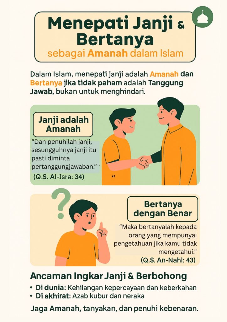 Menepati janji, bertanya dengan niat baik, dan menjunjung kebenaran adalah manifestasi iman dan akhlak. Dalam usaha, ini bukan hanya soal profesionalisme, tapi juga ibadah dan tanggung jawab sosial. (ds)