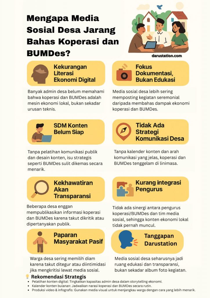 Darustation mengingatkan bahwa koperasi dan BUMDes bukan entitas yang harus bersaing, melainkan bisa saling melengkapi. Media sosial desa seharusnya menjadi ruang edukasi tentang perbedaan fungsi, potensi sinergi, dan dampak ekonomi dari keduanya.