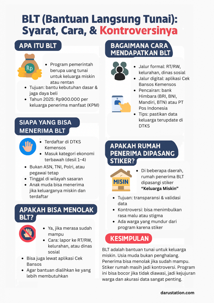 BLT adalah bantuan tunai untuk keluarga miskin, bukan untuk semua warga. Usia muda bukan penghalang selama memenuhi syarat ekonomi dan terdaftar di DTKS. Penerima yang sudah mampu bisa menolak, sementara pemasangan stiker di rumah penerima masih jadi kontroversi. Program ini juga rawan kebocoran jika tidak diawasi, sehingga kejujuran warga dan transparansi pemerintah menjadi kunci agar BLT benar-benar tepat sasaran. (ds)