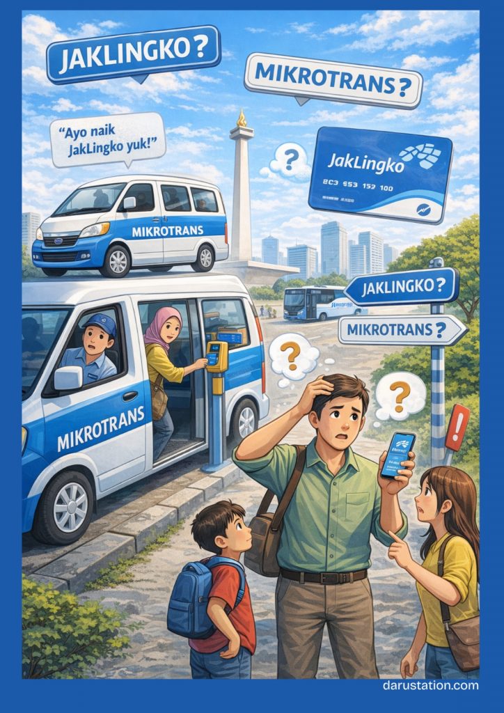 Karena branding JakLingko menempel di badan kendaraan, kartu pembayaran, hingga aplikasi, masyarakat secara alami menyamakan: