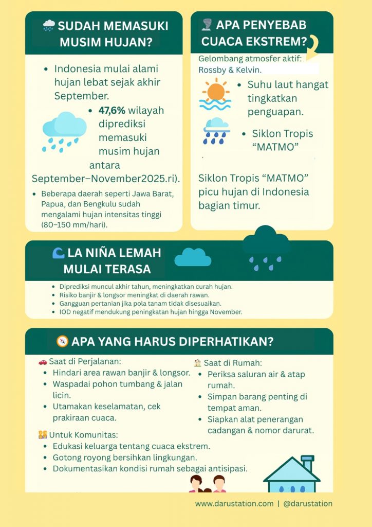 Oktober ini bukan hanya soal hujan, tapi juga soal kesiapan kita menghadapi perubahan. Cuaca memang tak bisa dikendalikan, tapi kita bisa mengantisipasi dampaknya. Yuk, jadikan informasi cuaca sebagai bagian dari rutinitas harian, dan ajak keluarga serta komunitas untuk lebih waspada. (ds)