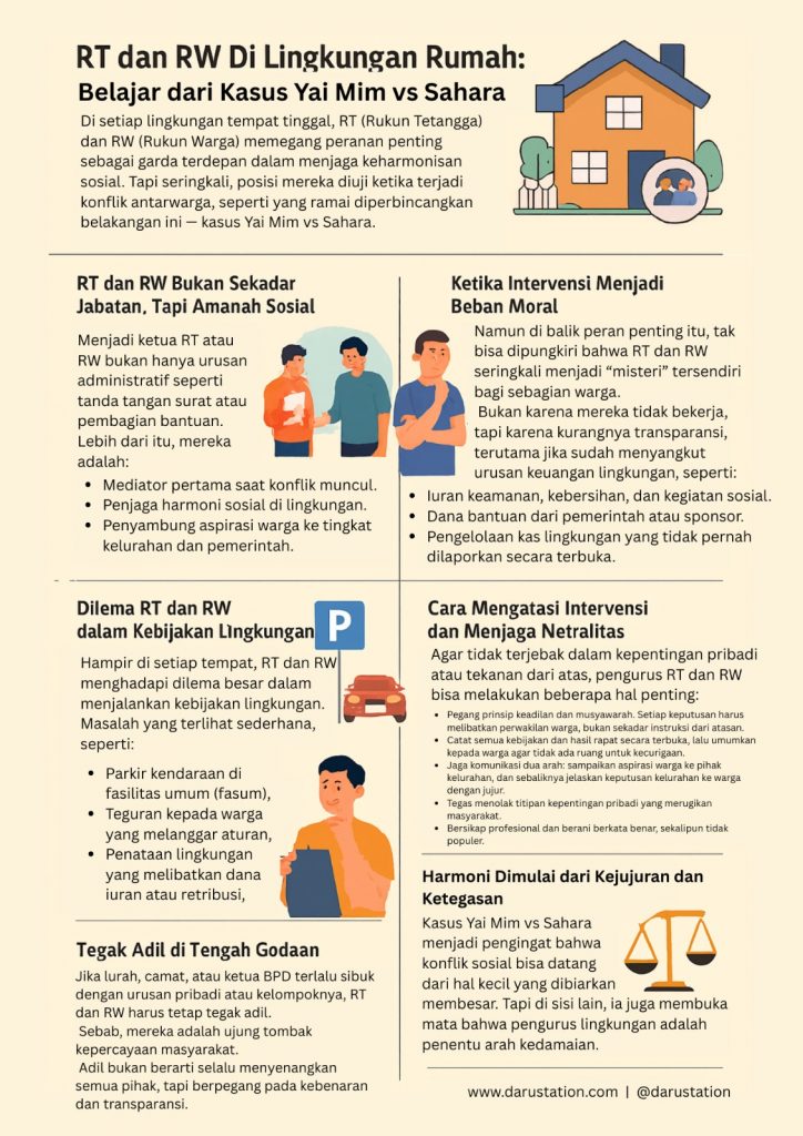 |Di setiap lingkungan tempat tinggal, RT (Rukun Tetangga) dan RW (Rukun Warga) memegang peranan penting sebagai garda terdepan dalam menjaga keharmonisan sosial. Tapi seringkali, posisi mereka diuji ketika terjadi konflik antarwarga, seperti yang ramai diperbincangkan belakangan ini — kasus Yai Mim vs Sahara.