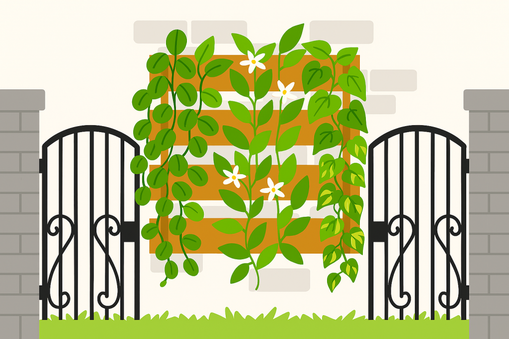 Bayangkan dinding pagar rumah dengan vertical garden berisi dolar, melati, dan sirih gading, lalu di bawahnya terbentang rumput hijau segar. Kombinasi ini: