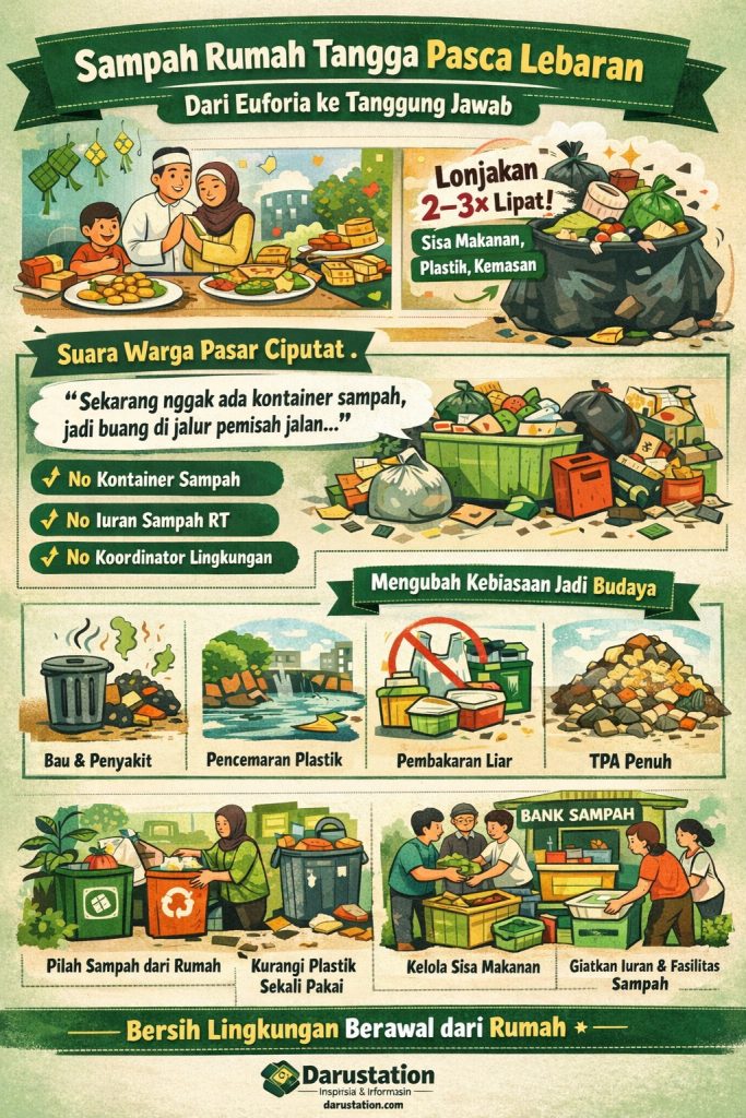 🌙 Lebaran selalu datang dengan cerita bahagia. Rumah yang ramai, hidangan melimpah, tawa yang kembali mengisi ruang-ruang yang lama sunyi. Namun, di balik kehangatan itu, ada satu hal yang sering kita abaikan—sampah rumah tangga yang menumpuk setelah perayaan usai.