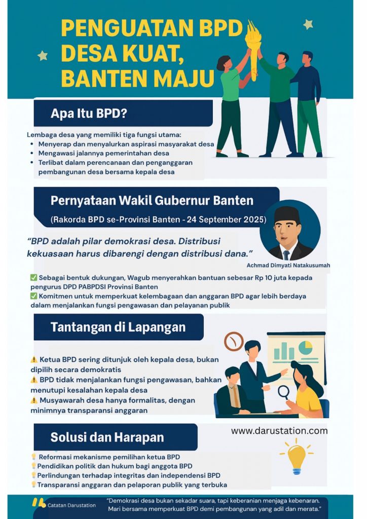 Darustation mencatat, bahwa di banyak desa, BPD belum sepenuhnya mandiri. Ketua BPD sering kali ditunjuk oleh kepala desa, bukan dipilih secara demokratis. Akibatnya, fungsi kontrol menjadi tumpul. BPD yang seharusnya menjadi pengawas justru menjadi pelindung kesalahan. Ini bukan demokrasi, tapi ilusi partisipasi.