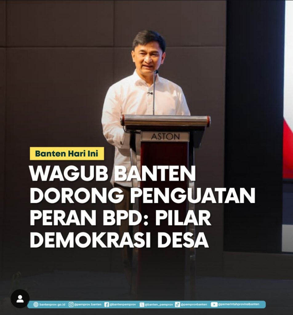 |Dalam semangat memperkuat pemerintahan desa yang demokratis dan partisipatif, Wakil Gubernur Banten Achmad Dimyati Natakusumah menegaskan pentingnya penguatan Badan Permusyawaratan Desa (BPD) sebagai elemen strategis pembangunan desa. Hal ini disampaikan dalam Rapat Koordinasi Daerah (Rakorda) BPD se-Provinsi Banten yang digelar pada 24 September 2025 di Hotel Aston & Convention Center, Kota Serang.