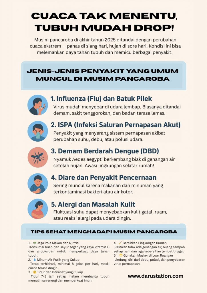 |Menjelang akhir Oktober hingga akhir tahun 2025, Indonesia kembali memasuki masa pancaroba — masa peralihan dari kemarau menuju musim hujan. Di periode ini, cuaca sering kali terasa tidak menentu: pagi panas menyengat, siang berangin, lalu sore hingga malam diguyur hujan deras. Kondisi seperti ini bukan hanya membuat aktivitas terganggu, tetapi juga bisa melemahkan daya tahan tubuh. Akibatnya, berbagai penyakit musiman mulai bermunculan di sekitar kita.