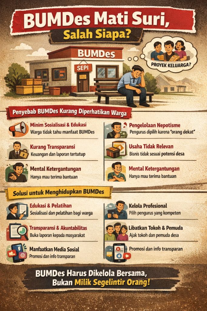 Yang lebih menyedihkan, dalam beberapa kasus, BUMDes malah dicap warga sebagai “usaha milik orang dalam”, “proyek perangkat desa”, atau bahkan “usaha keluarga yang dibungkus nama desa.”