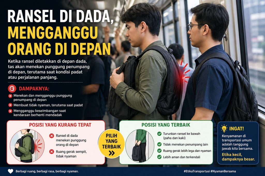 Ransel di dada mungkin terasa aman bagi kita. Tapi kalau itu membuat orang lain tidak nyaman, berarti ada yang perlu disesuaikan.