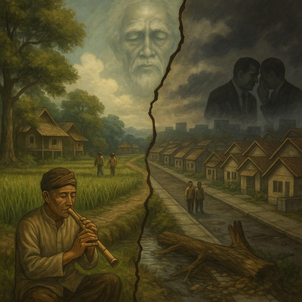 Di satu masa, Desa Daru di Kabupaten Tangerang adalah hamparan hijau kehidupan. Sawah menghampar sejauh mata memandang, pohon-pohon menjulang di setiap penjuru kampung, dan suara serangga serta suling bambu seakan berpadu dengan hembusan angin sore. Masyarakat hidup sederhana, jujur, dan saling mengenal. Waktu seakan berjalan pelan, mengikuti irama alam dan petuah karuhun. Namun kini, semuanya …