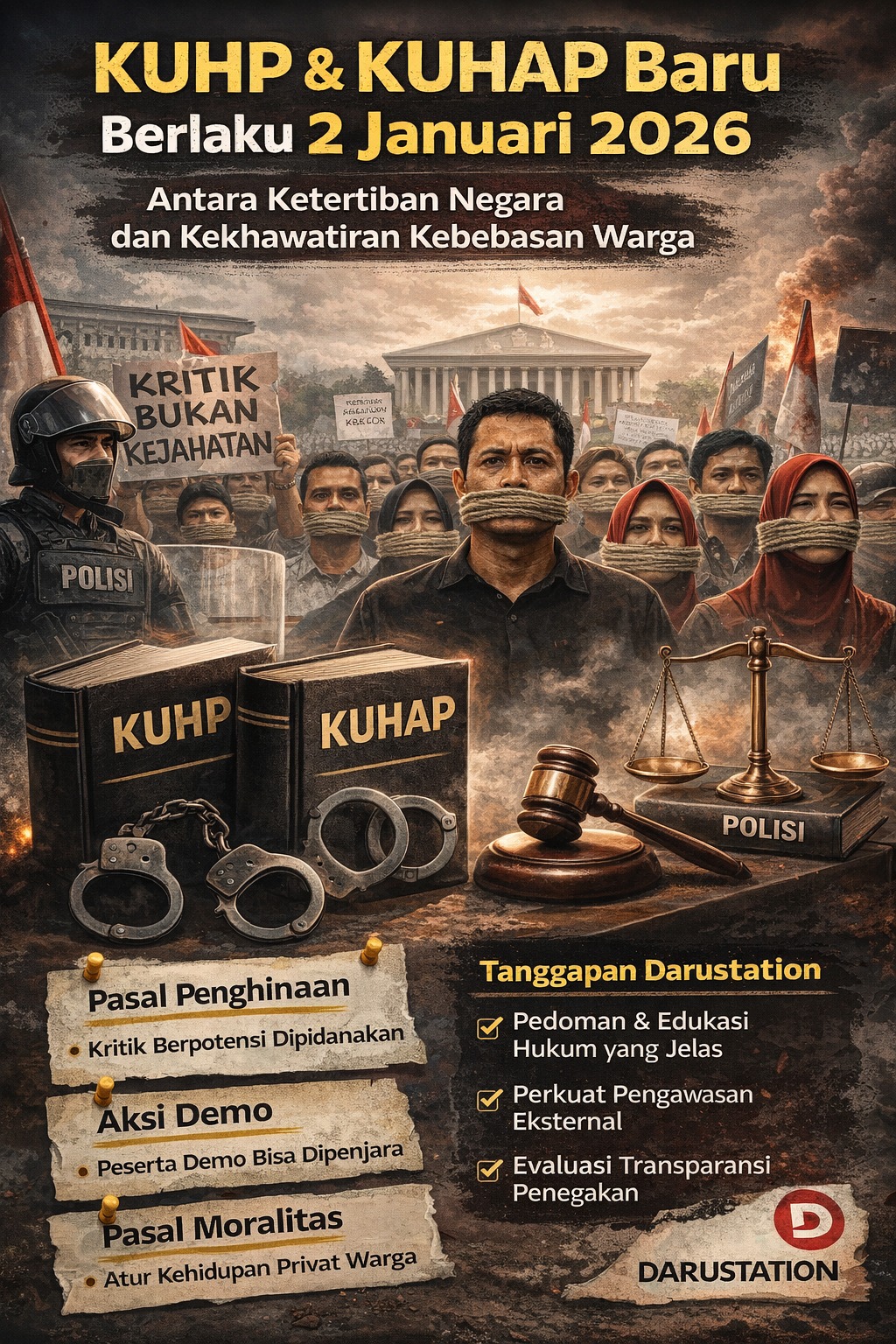 Mulai 2 Januari 2026, Indonesia resmi memasuki fase baru sistem hukum pidana dengan diberlakukannya Kitab Undang-Undang Hukum Pidana (KUHP) dan Kitab Undang-Undang Hukum Acara Pidana (KUHAP) yang baru. Pemerintah menyebut kebijakan ini sebagai bentuk modernisasi hukum nasional yang lebih sesuai dengan nilai-nilai Indonesia. Namun, di tengah semangat pembaruan tersebut, sejumlah pasal justru memicu kekhawatiran publik. …
