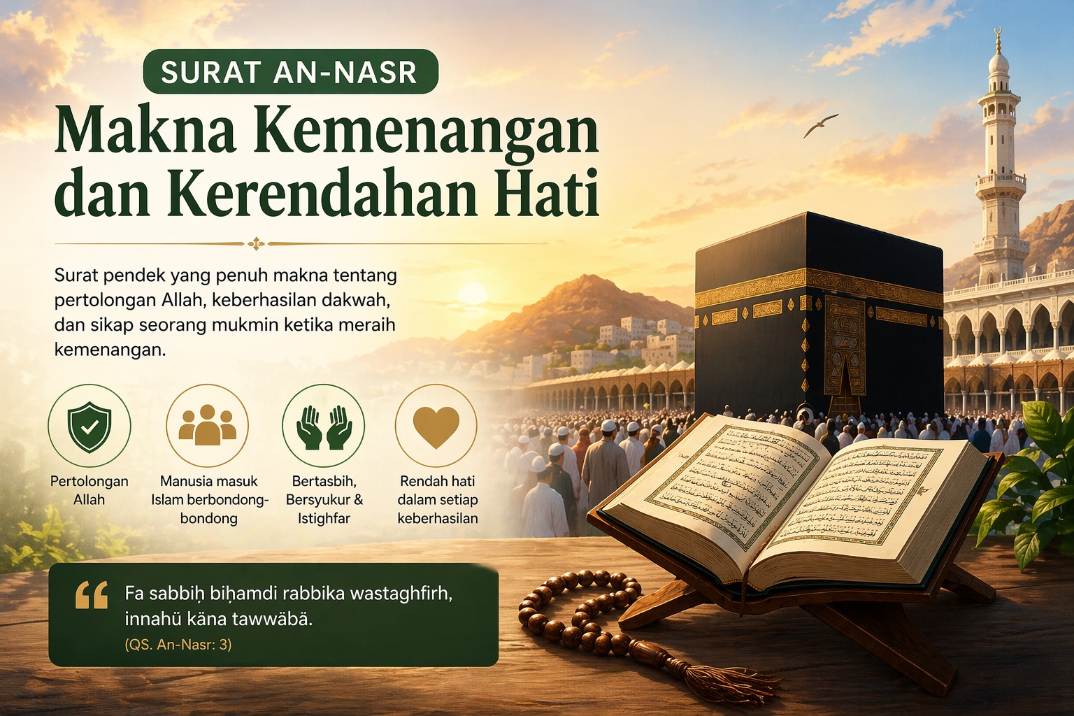 đź“– Surat An-Nasr adalah salah satu surat pendek dalam Al-Qur’an yang memiliki makna sangat dalam dan menyentuh. Meskipun hanya terdiri dari tiga ayat, kandungannya mencakup pesan besar tentang kemenangan, keberhasilan dakwah, serta sikap seorang mukmin ketika mencapai puncak kesuksesan. Dalam artikel ini, kita akan membahas teks lengkap Surat An-Nasr (Arab, latin, dan terjemahan), tafsir per …